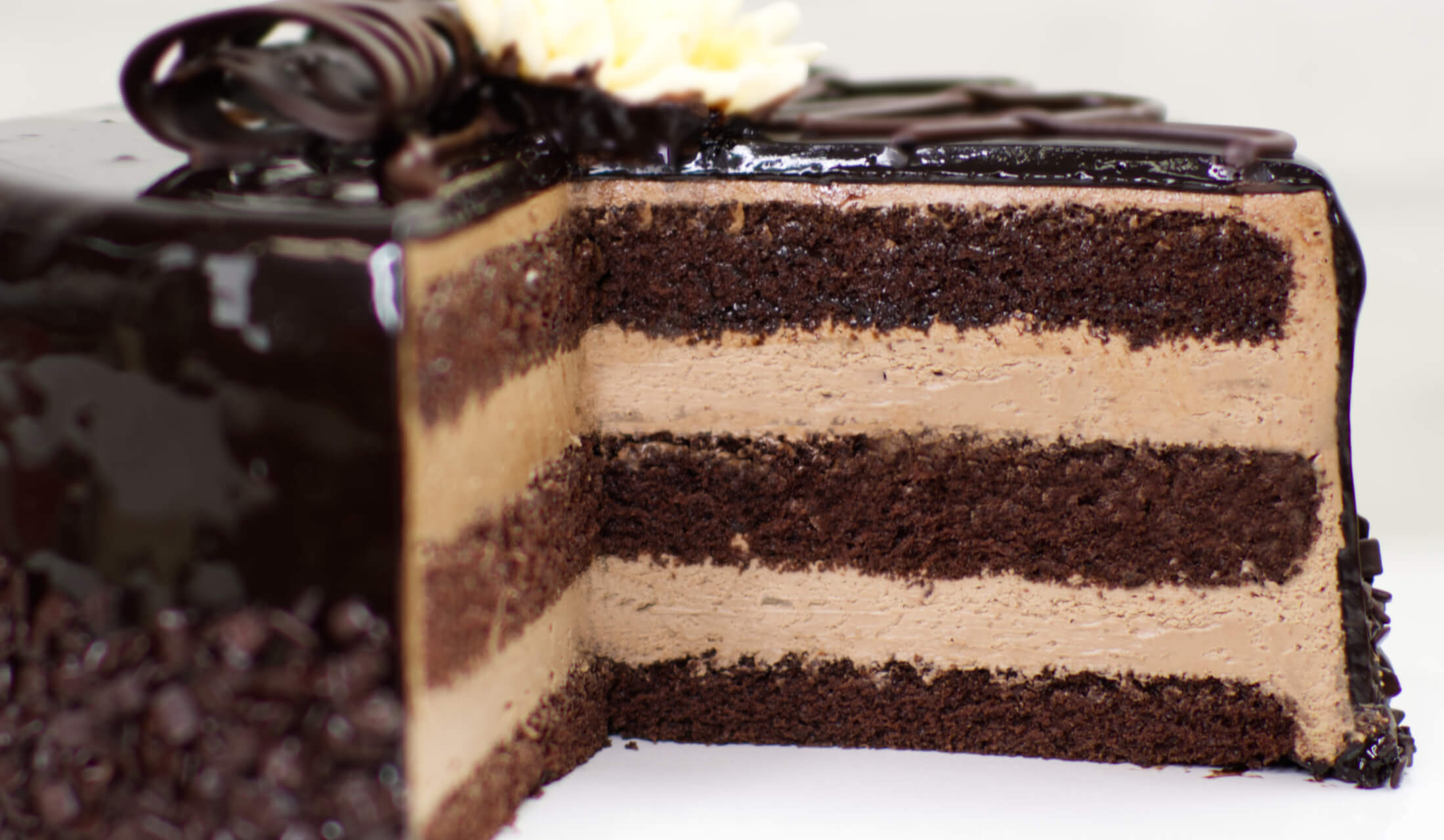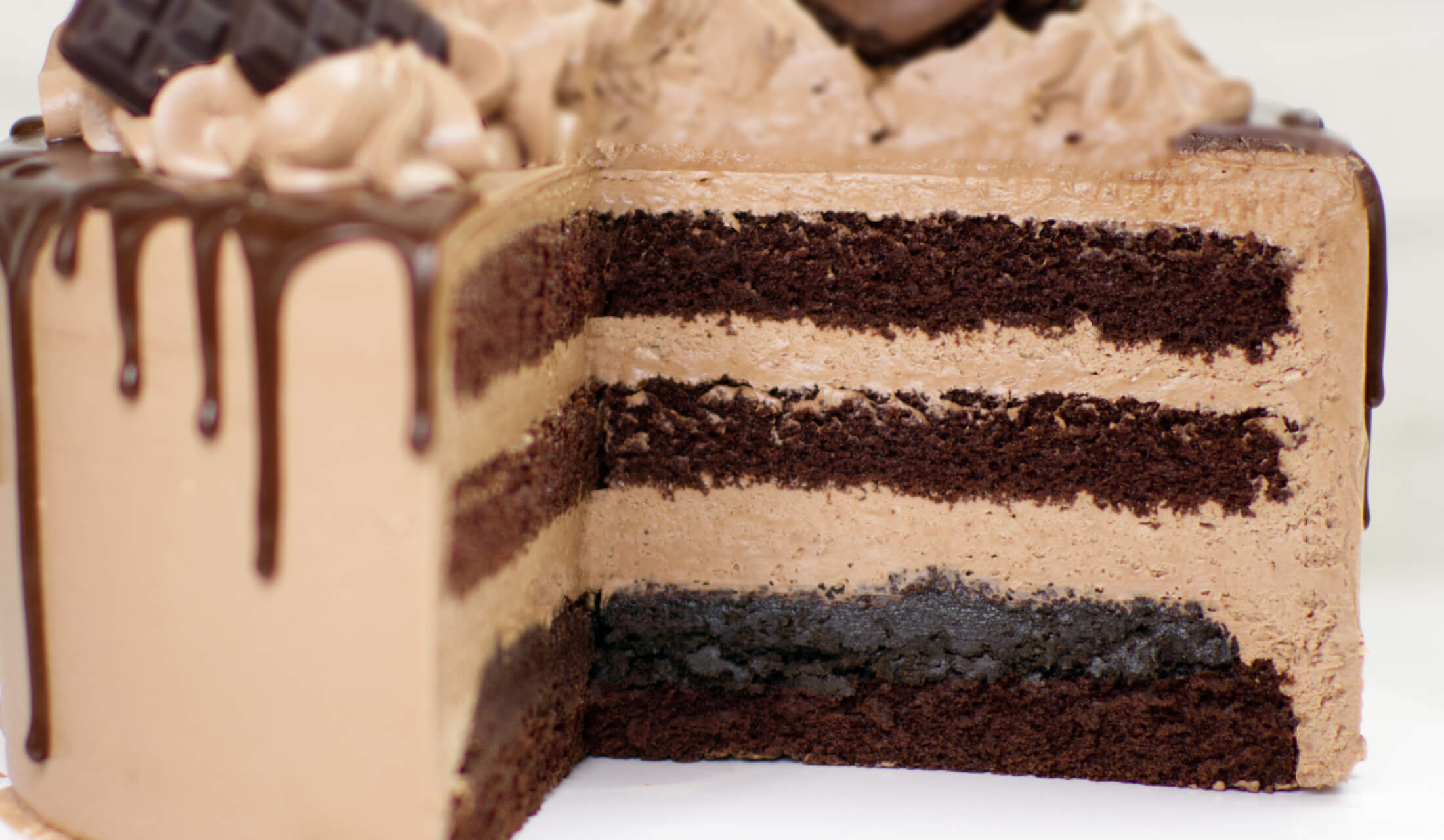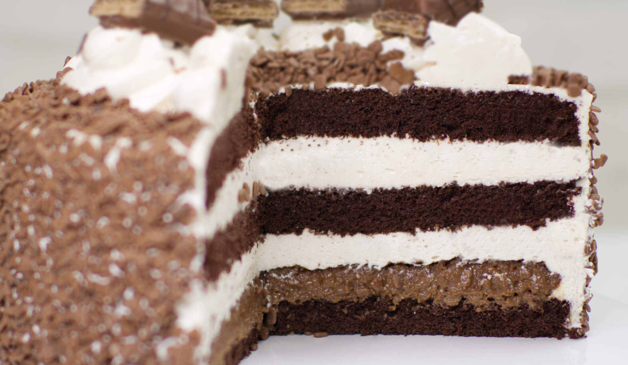 (biszkopt o smaku czekoladowym, przekładka z chrupiącej trufli, bita śmietana zmiksowana z czekoladą deserową)