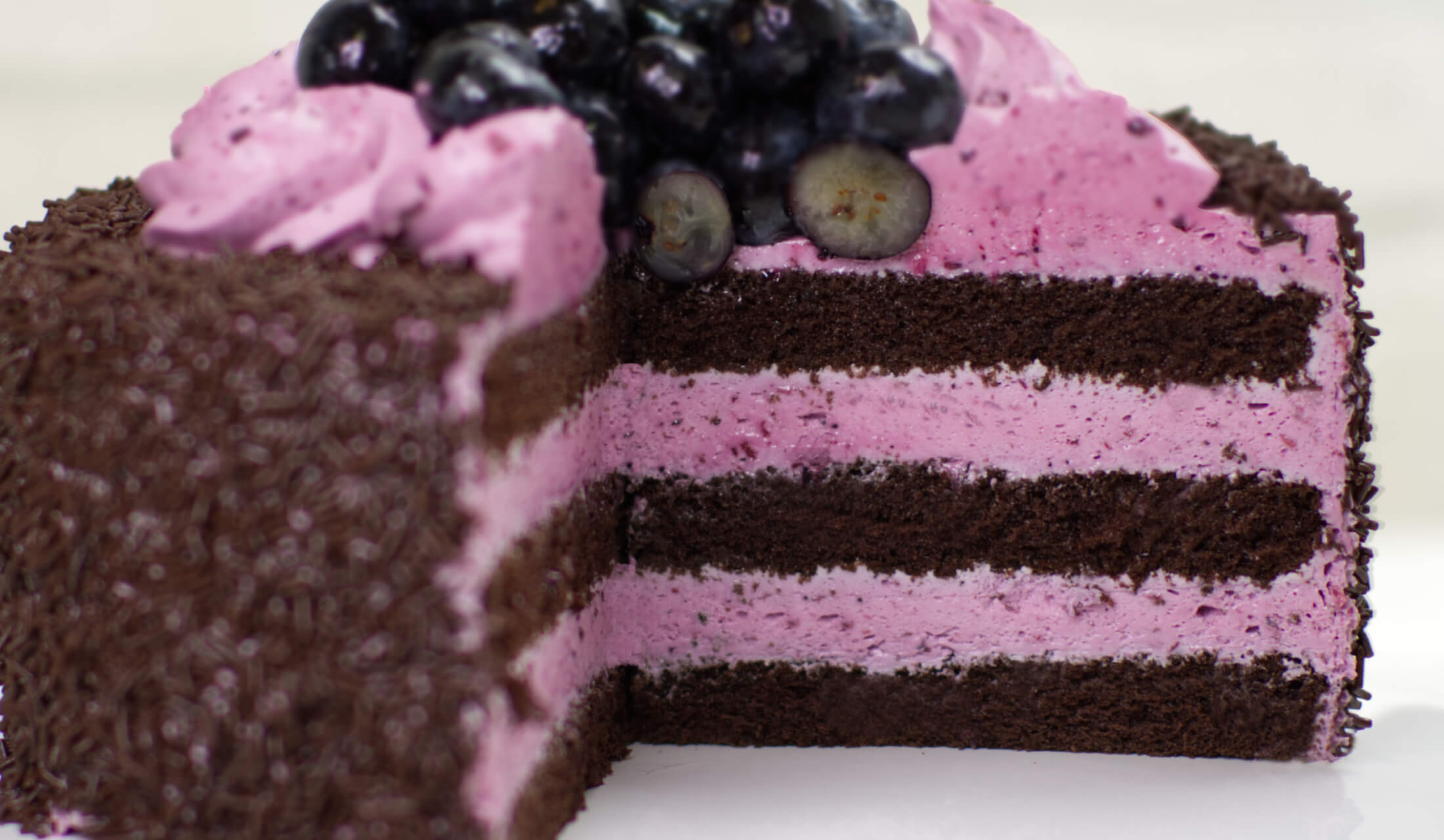 (biszkopt czekoladowy, krem na bazie śmietanki zmiksowanej z jagodami)