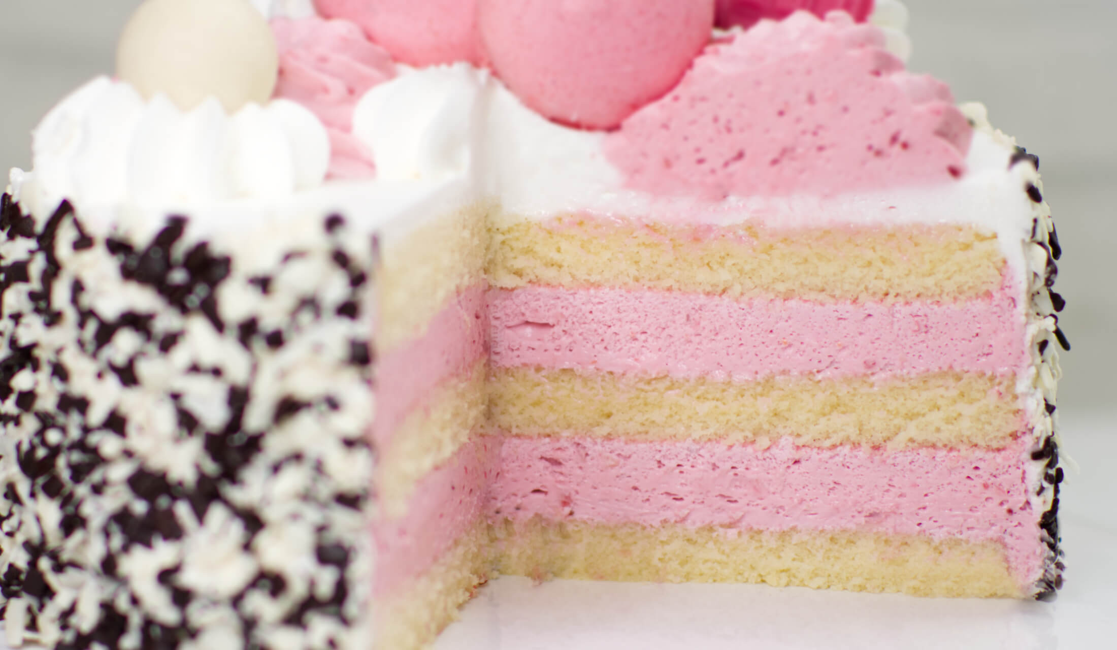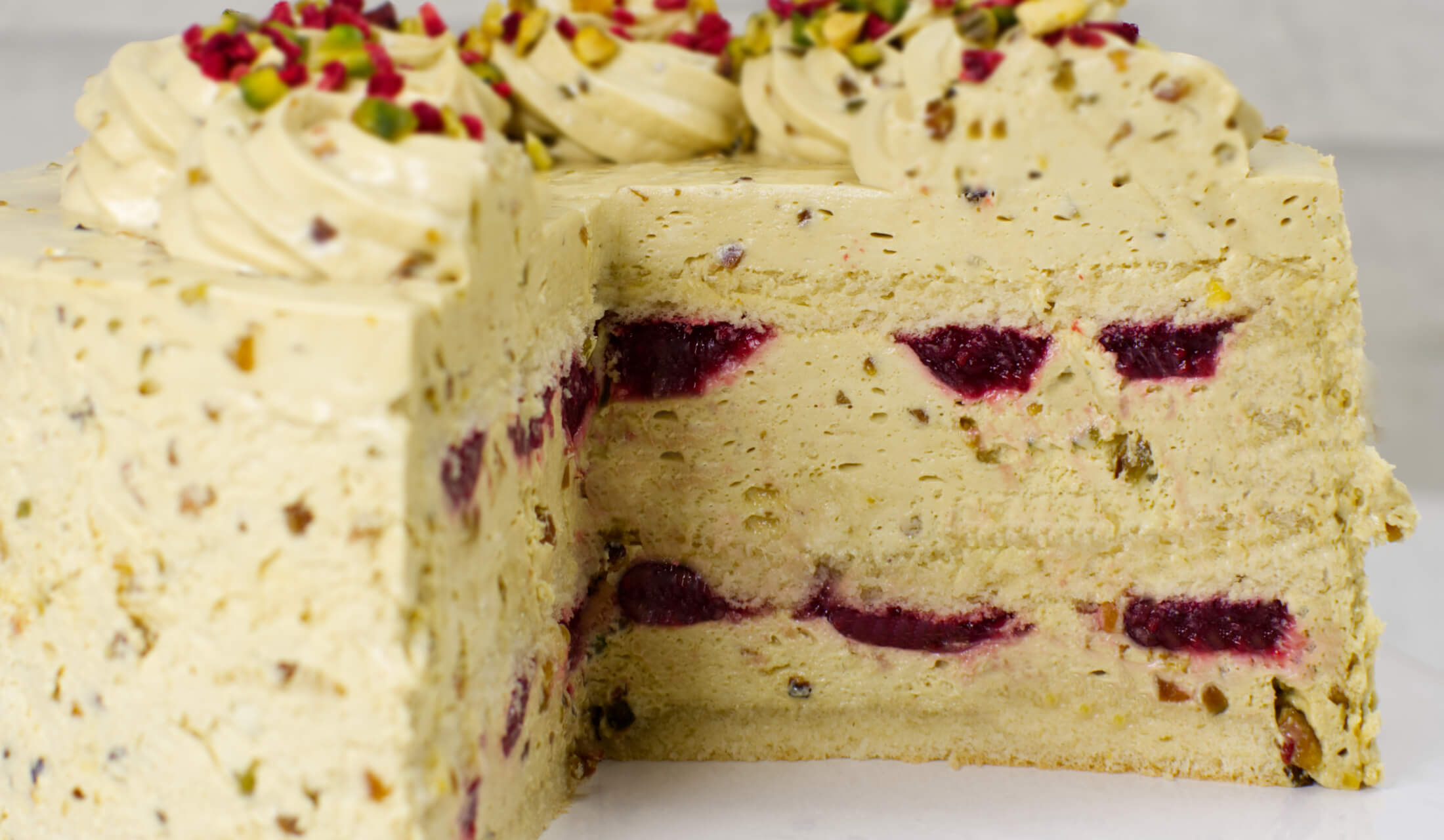 (jasny biszkopt, krem pistacjowy na bazie śmietanki, owoce malin w żelce)
