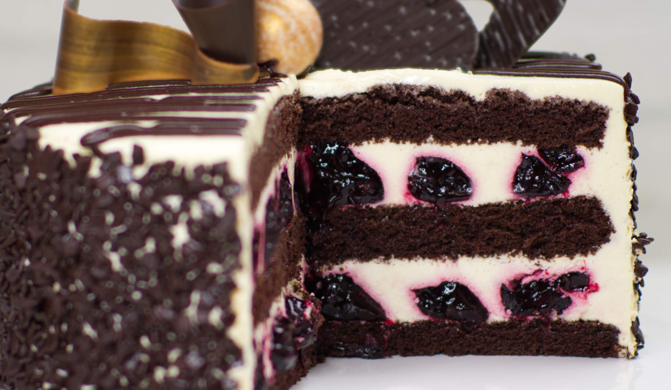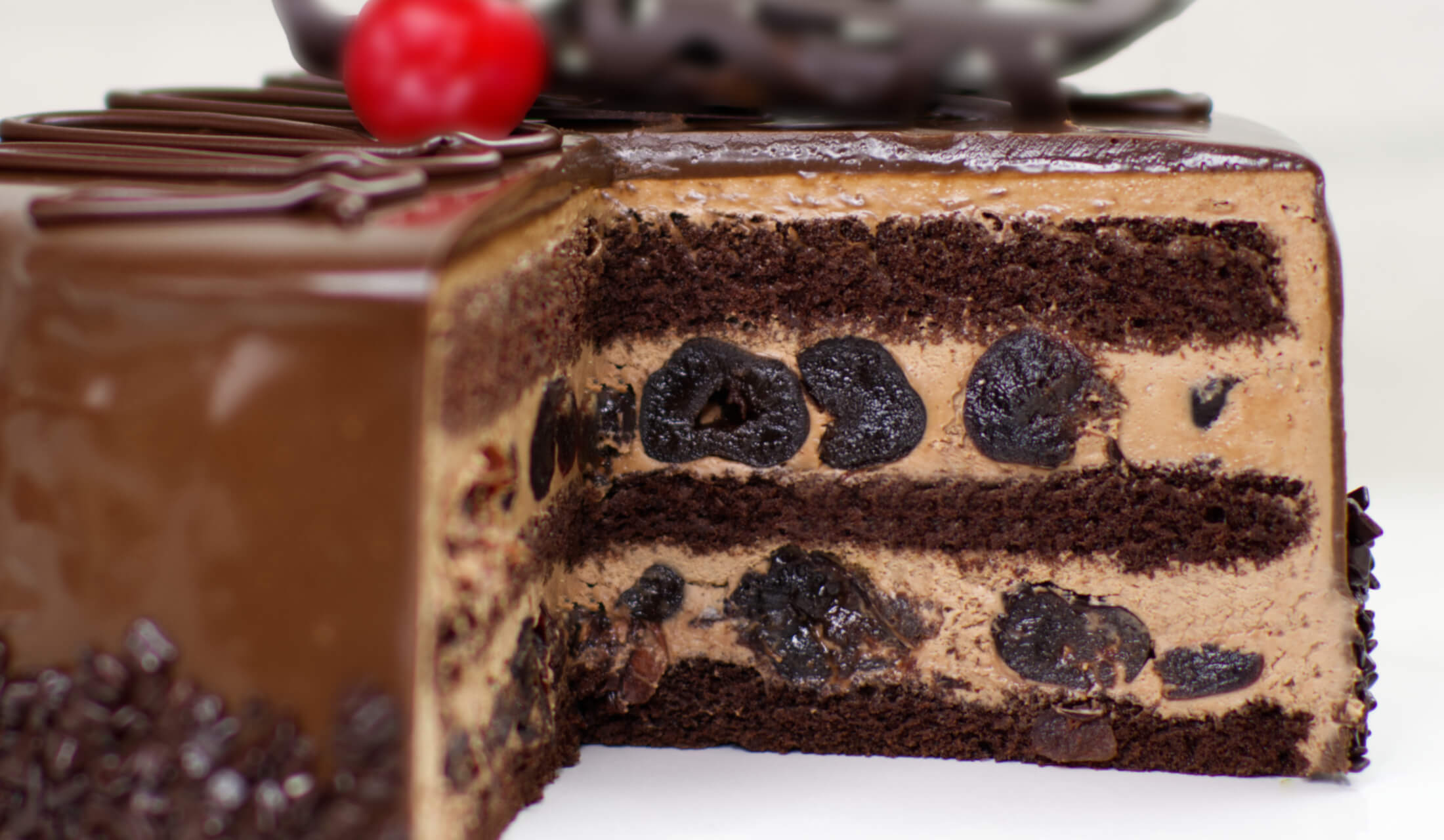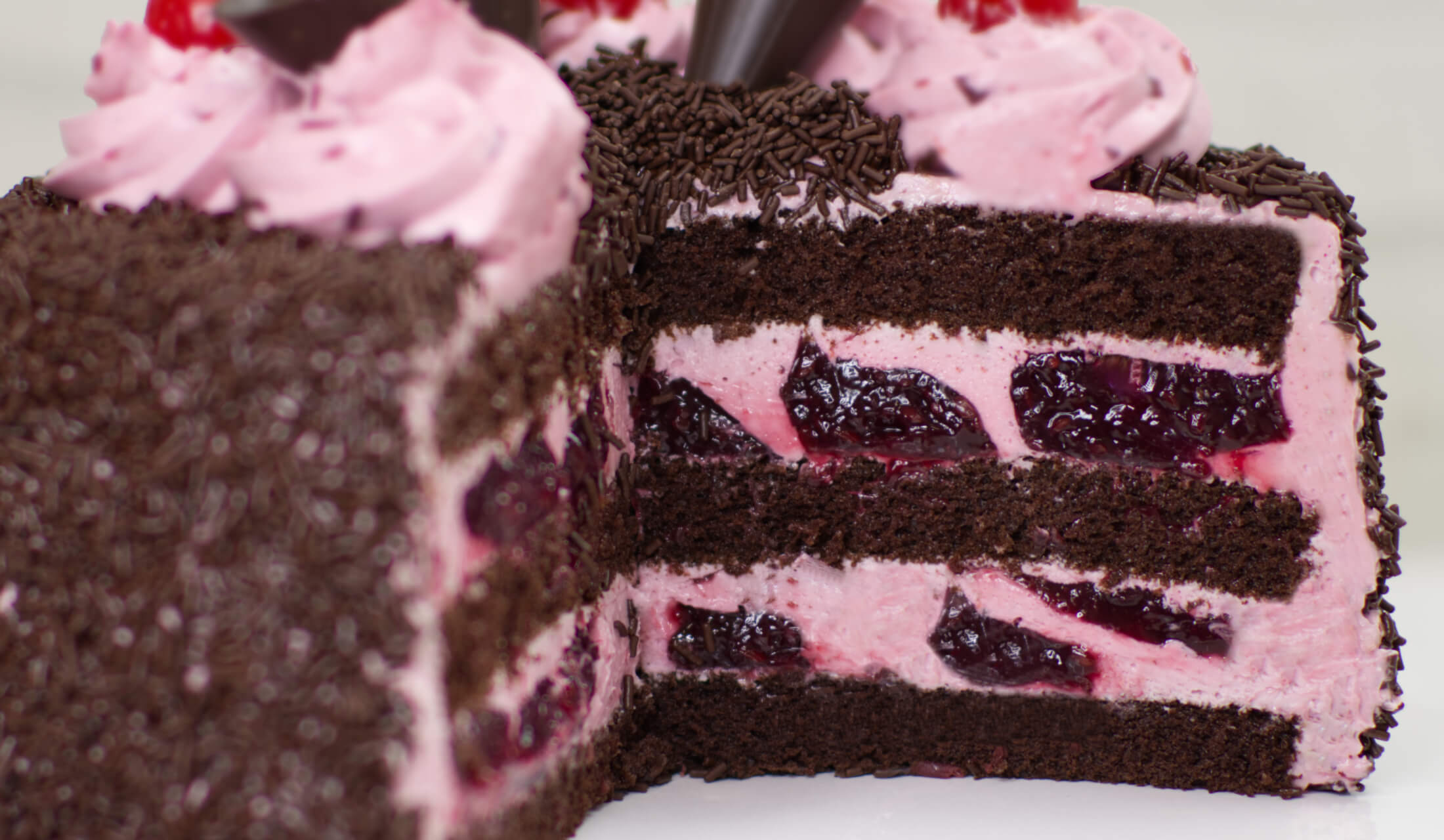 (biszkopt o smaku czekoladowym, krem na bazie śmietanki zmiksowanej z wiśniami, jeżyna w żelce)