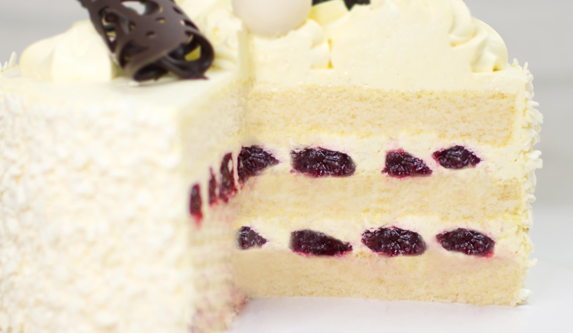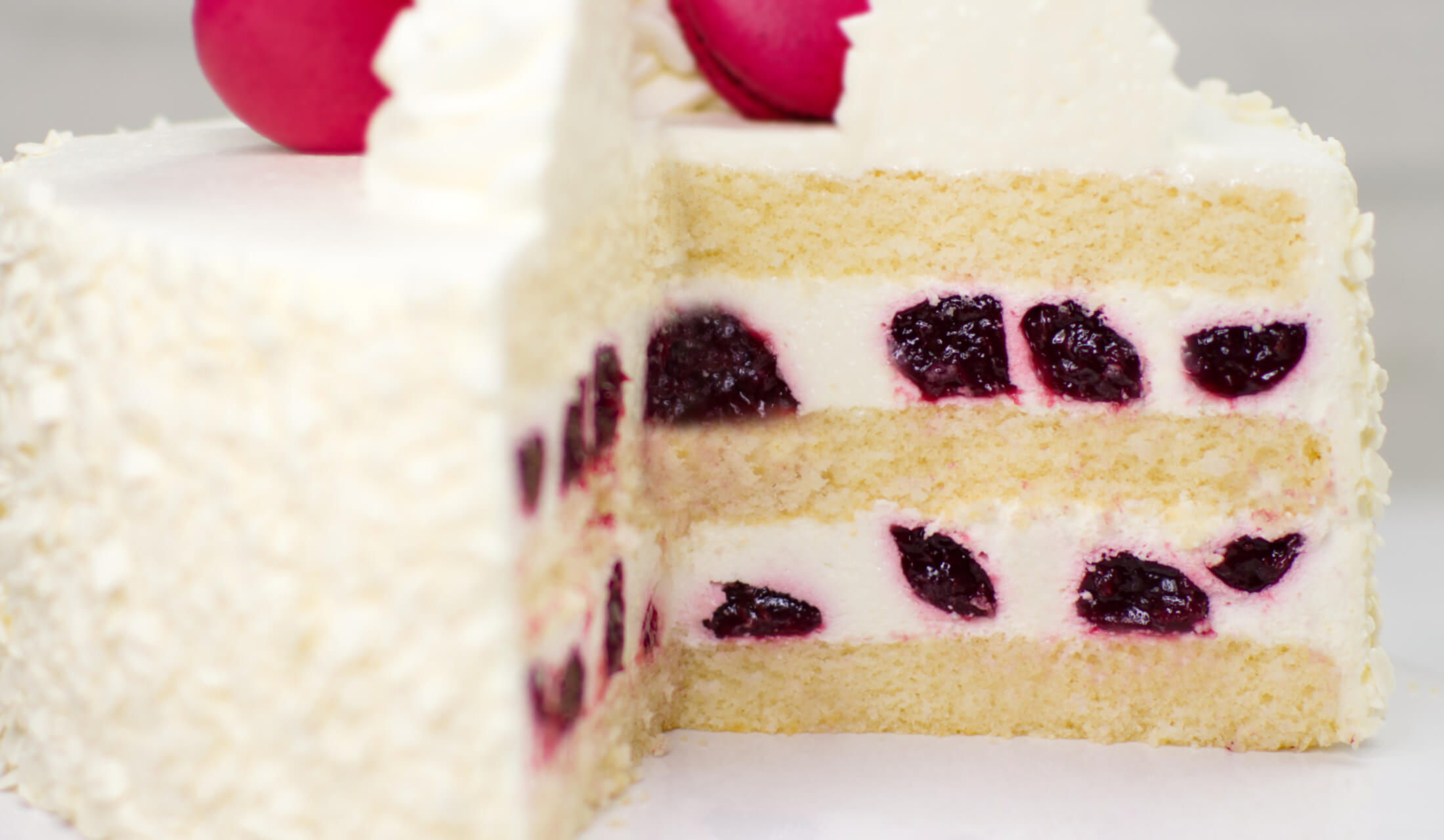 (jasny biszkopt, krem waniliowy na bazie bitej śmietany z ziarenkami wanilii, owoce żurawiny w żelce)