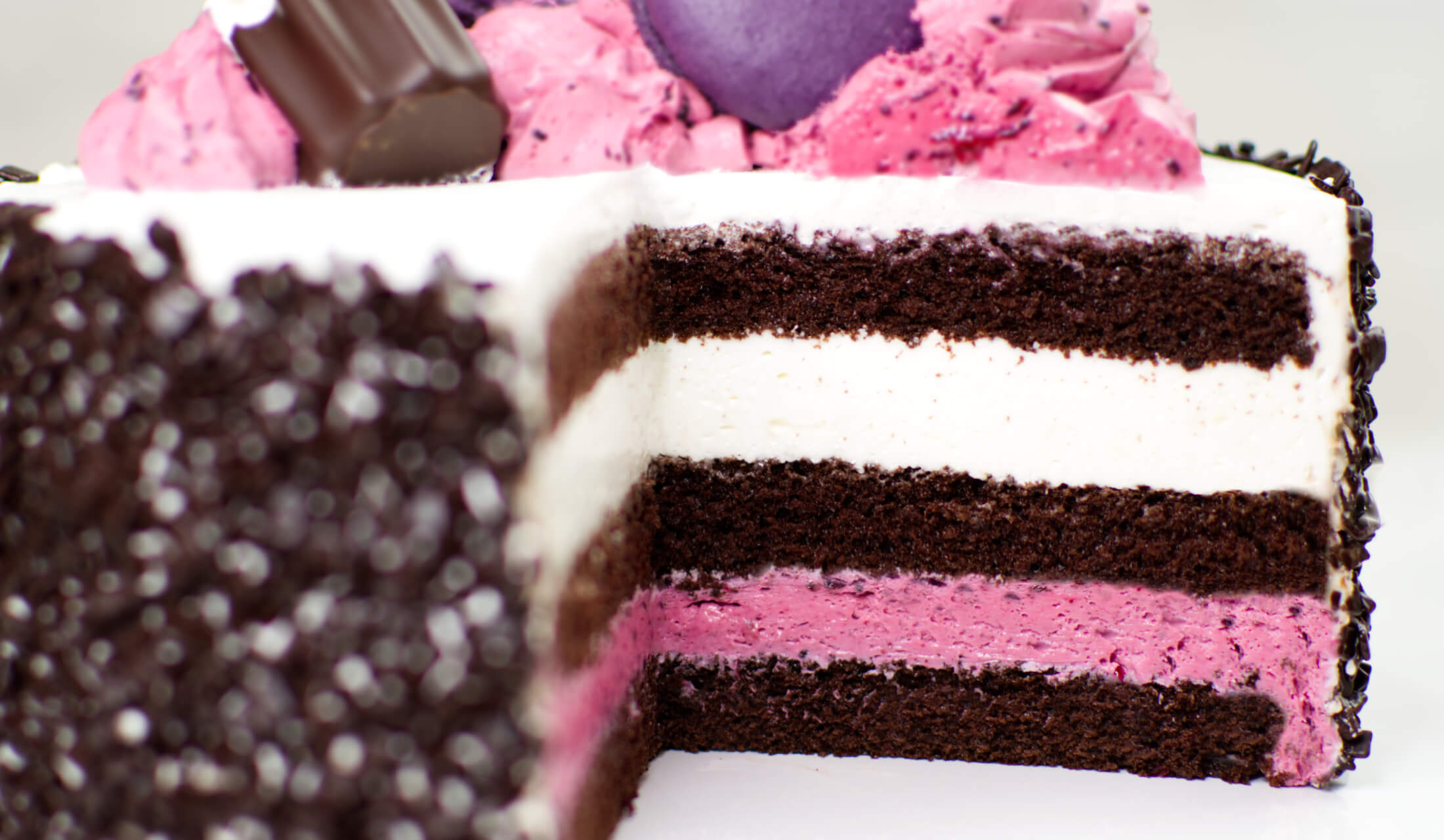 (biszkopt o smaku czekoladowym, krem na bazie śmietanki zmiksowanej z czarną porzeczką. Krem o smaku serka na bazie śmietanki)