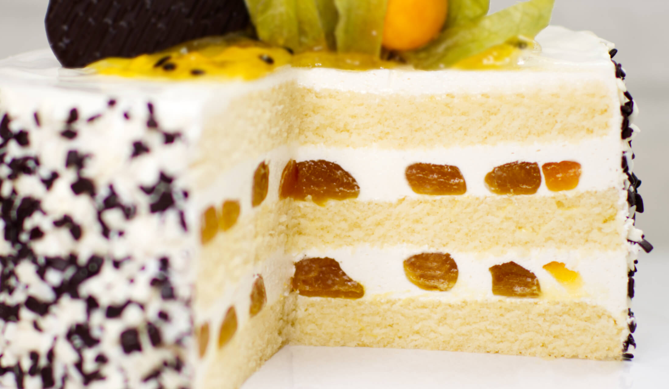 (jasny biszkopt, krem na bazie śmietanki zmiksowanej z owocami marakui, owoce marakui w żelce)