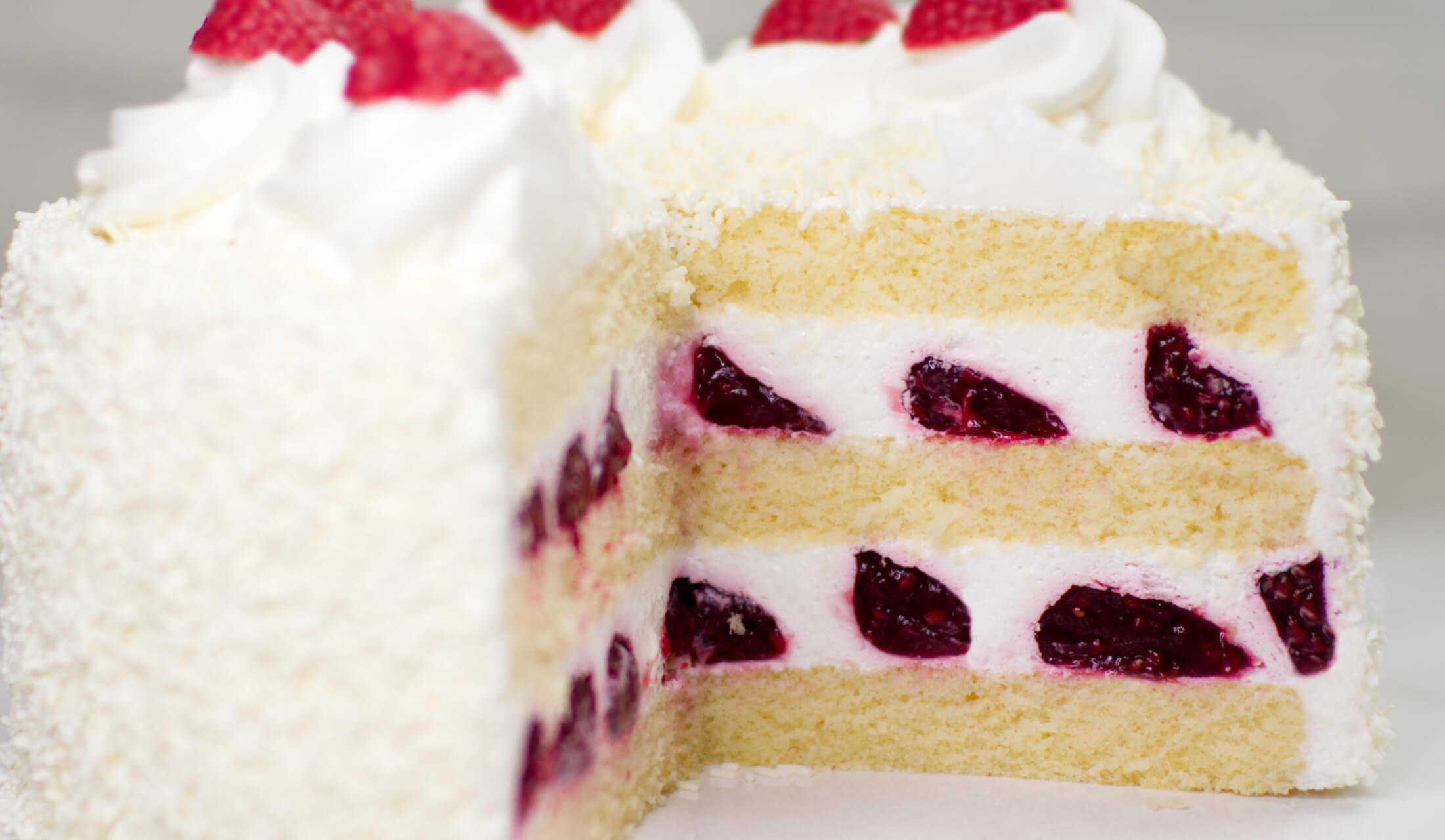 (jasny biszkopt, krem o smaku serka mascarpone na bazie śmietanki, owoce malin w żelce)