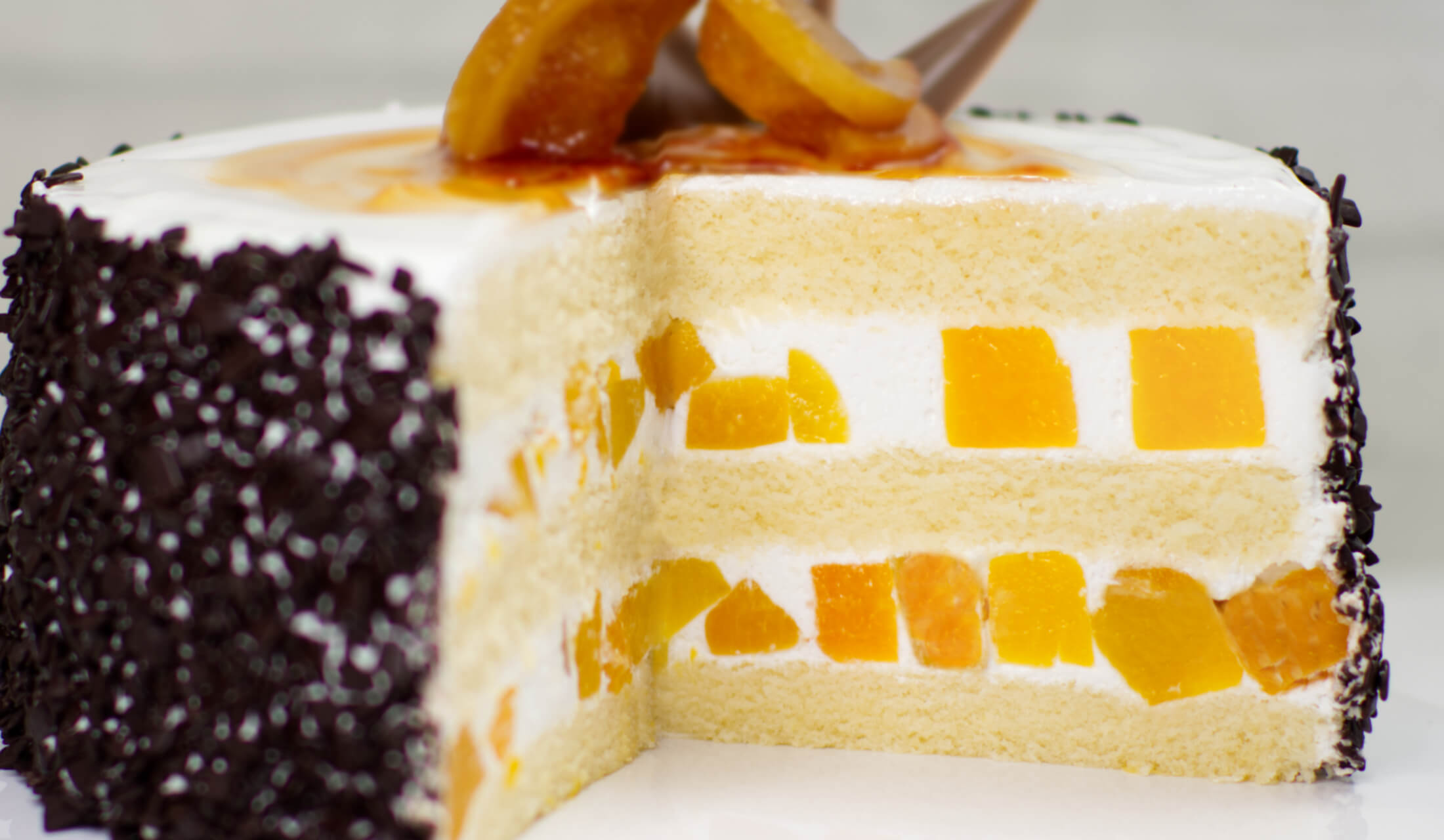 (jasny biszkopt, bita śmietana z kawałkami brzoskwiń)